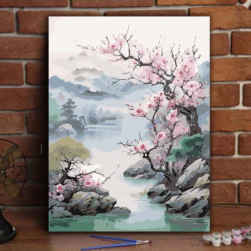 Kit de pintura por números de árboles de Sakura entre río. Perfecto para principiantes o amantes del arte DIY, este kit te brinda todo lo que necesitas para relajarte, divertirte y decorar con tu propia creación. Tamaño 40cm x 50cm.