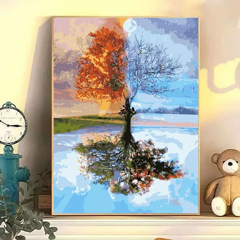 Set de pintura por números de árbol en dos estaciones. Ideal para quienes se inician en el arte o disfrutan de proyectos creativos, este kit incluye todo lo necesario para disfrutar de una experiencia relajante mientras creas tu propia obra de arte. Tamaño: 40 cm x 50 cm.