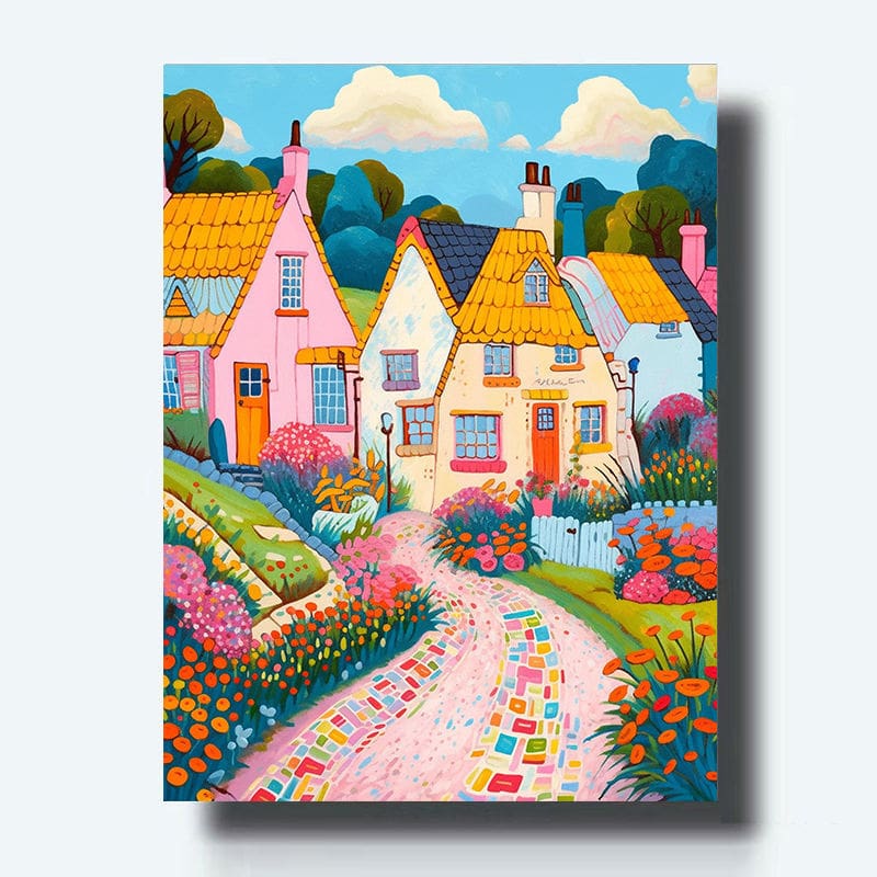 Set de pintura por números de un camino hacia casas coloridos. Ideal para quienes se inician en el arte o disfrutan de proyectos creativos, este kit incluye todo lo necesario para disfrutar de una experiencia relajante mientras creas tu propia obra de arte. Tamaño: 40 cm x 50 cm.