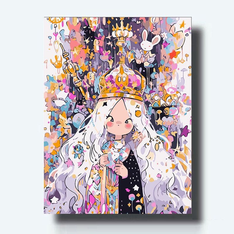 Set de pintura por números dechica con corona con fondo animado y colorido. Ideal para quienes se inician en el arte o disfrutan de proyectos creativos, este kit incluye todo lo necesario para disfrutar de una experiencia relajante mientras creas tu propia obra de arte. Tamaño: 40 cm x 50 cm.