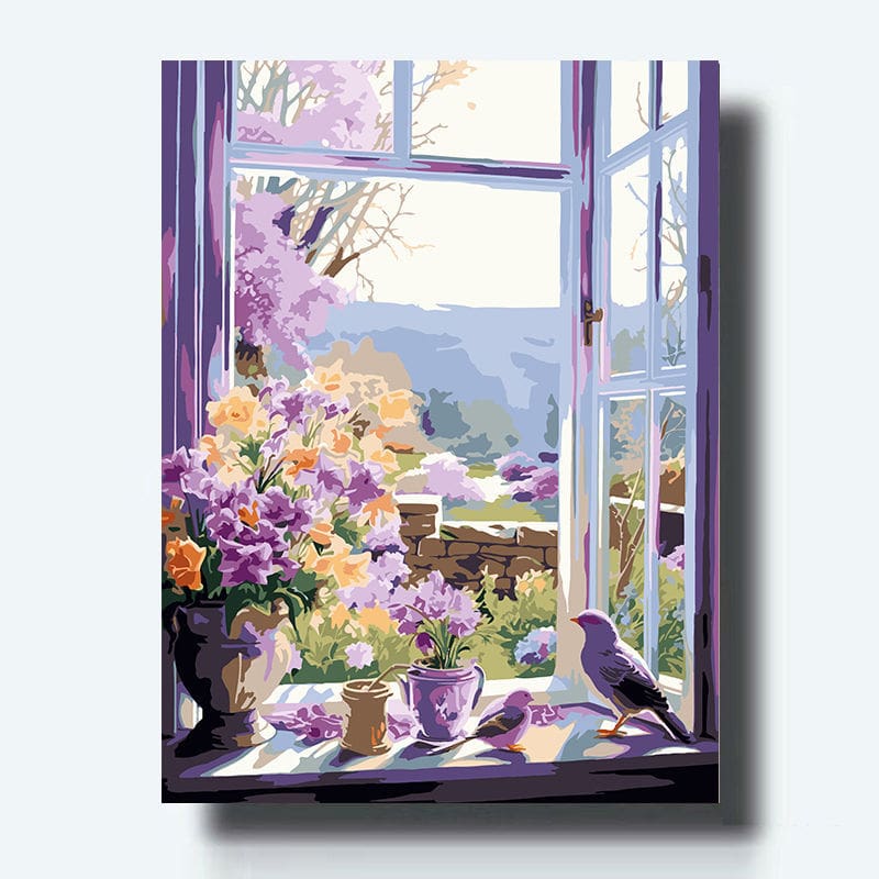 Set de pintura por números de un hermoso paisaje de fondo y pajaritos posando en la ventana. Ideal para quienes se inician en el arte o disfrutan de proyectos creativos, este kit incluye todo lo necesario para disfrutar de una experiencia relajante mientras creas tu propia obra de arte. Tamaño: 40 cm x 50 cm.