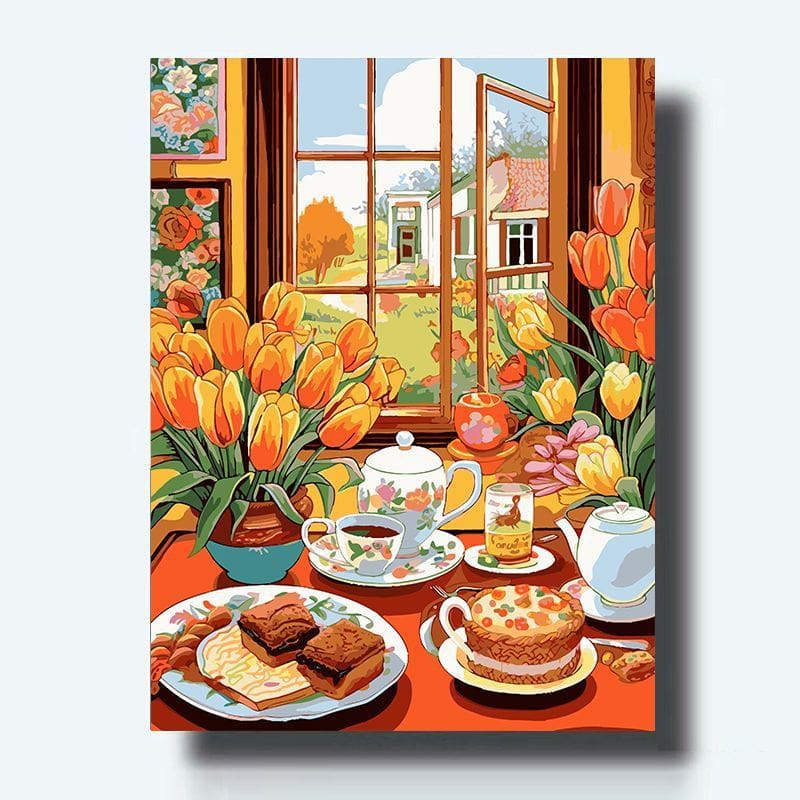 Set de pintura por números de una hermosa tarde de té. Ideal para quienes se inician en el arte o disfrutan de proyectos creativos, este kit incluye todo lo necesario para disfrutar de una experiencia relajante mientras creas tu propia obra de arte. Tamaño: 40 cm x 50 cm.