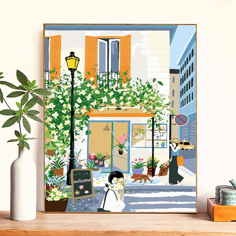 Set de pintura por números de una cafetería. Ideal para quienes se inician en el arte o disfrutan de proyectos creativos, este kit incluye todo lo necesario para disfrutar de una experiencia relajante mientras creas tu propia obra de arte. Tamaño: 40 cm x 50 cm.