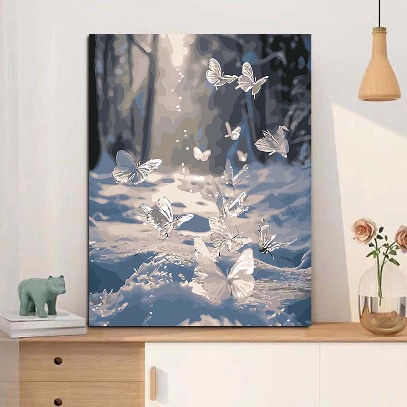 Set de pintura por números de Mariposas blancas en nieve. Ideal para quienes se inician en el arte o disfrutan de proyectos creativos, este kit incluye todo lo necesario para disfrutar de una experiencia relajante mientras creas tu propia obra de arte. Tamaño: 40 cm x 50 cm.