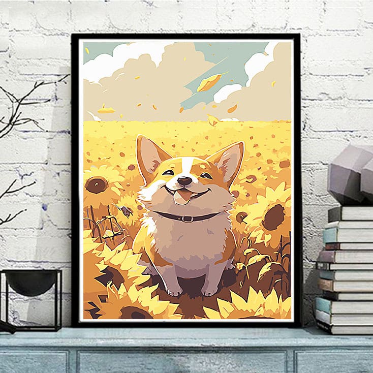 Kit de pintura por números, perrito sonriendo entre girasoles. Perfecto para principiantes o amantes del arte DIY, este kit te brinda todo lo que necesitas para relajarte, divertirte y decorar con tu propia creación. Tamaño 40cm x 50cm.
